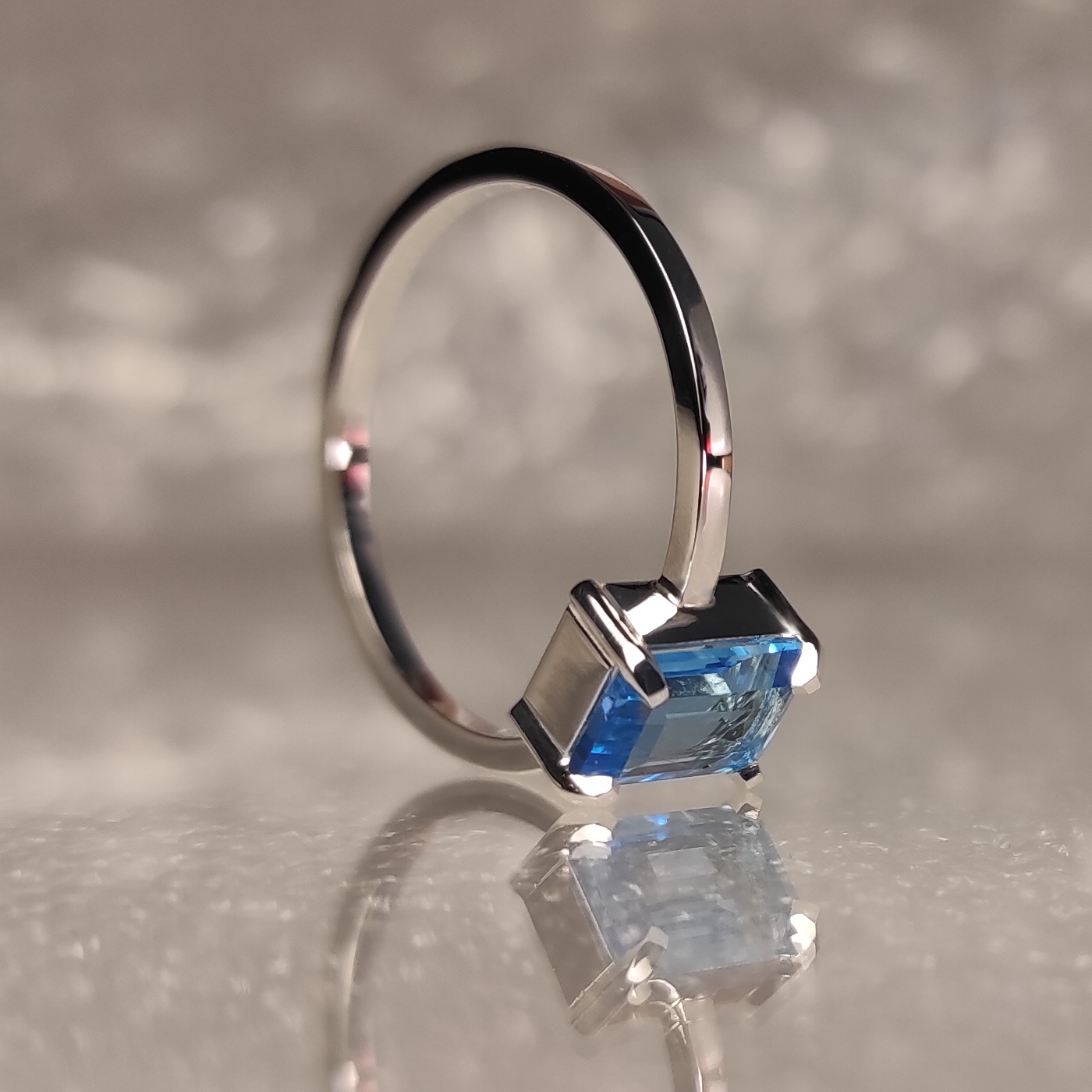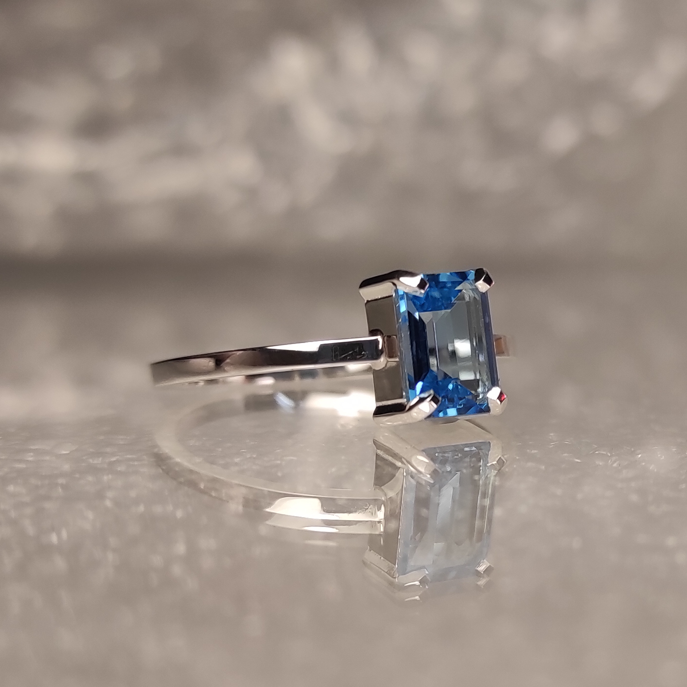 Pierścionek wykonany ze srebra próby 925. Kamień główny Topaz Swiss Blue 5x7mm w szlifie szmaragdowym. Wyrób rodowany. Dostępny na zamówienie. Możliwość personalizacji.